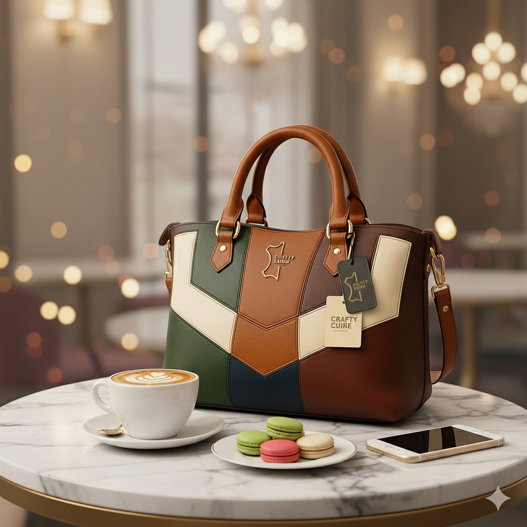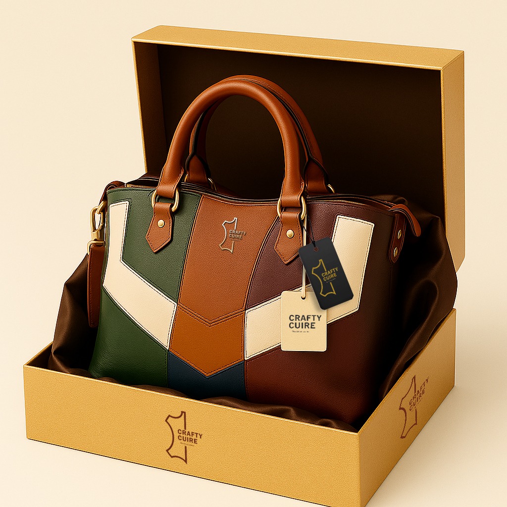 The Crafty Cure Multi-Color Handmade Leather Bag is a masterpiece of luxury craftsmanship and artistic design. Made from premium full-grain leather, this bag features a unique patchwork of tan brown, cream, green, navy, and chocolate leather panels, giving it a bold yet classy personality.